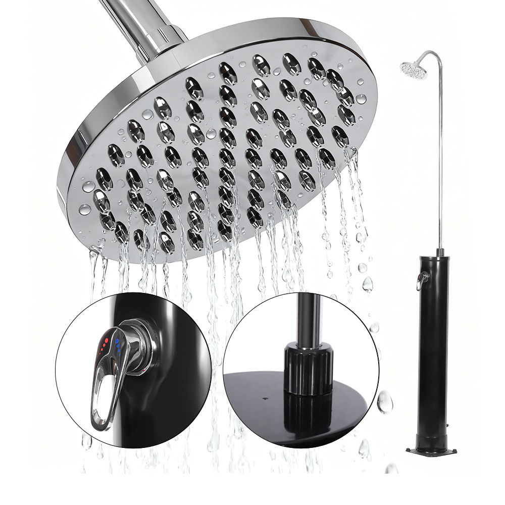 Erős napfénynek kitéve a 18/20 literes zuhanycsőben lévő víz természetes módon akár 60°C-ra is felmelegszik, áram nélkül, kényelmes és környezetbarát zuhanyozási megoldást kínálva. Egyszerűen csatlakoztasson egy szokásos kerti tömlőt a zuhanycső könnyű feltöltéséhez. Az UV-álló műanyagból készült LY18L01-B 18 literes kerek testű kültéri kerti úszómedencés napelemes zuhany tartósságra készült, és szükség esetén könnyen szétszedhető és szállítható. Masszív rozsdamentes acél, PVC, ABS, réz és fém talpa megbízható stabilitást biztosít, és a készüléket még gyakori használat során is biztonságosan a helyén tartja. Ezenkívül tartalmaz egy szabványos kerti tömlőcsatlakozót a gyors feltöltéshez, valamint egy leeresztő dugót, amely lehetővé teszi a zuhanycső könnyű ürítését, így egyszerű a zuhany előkészítése a téli tároláshoz.