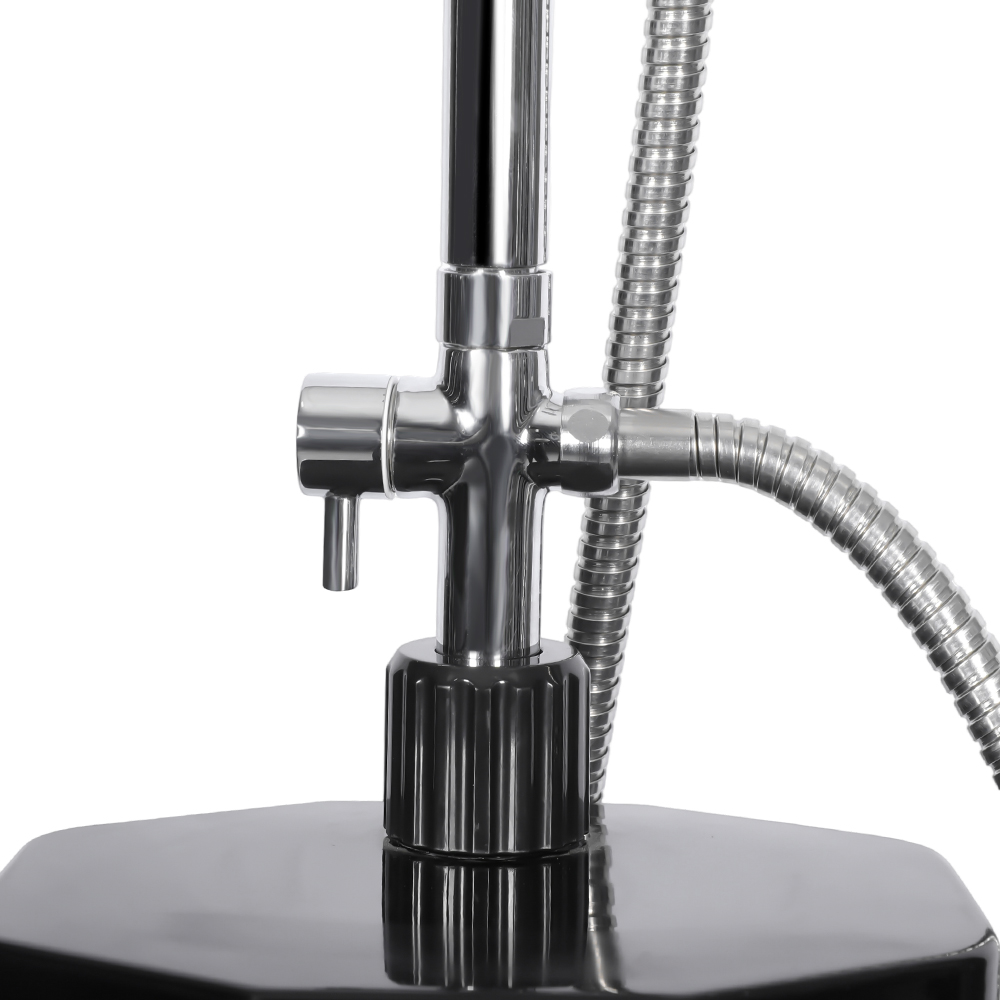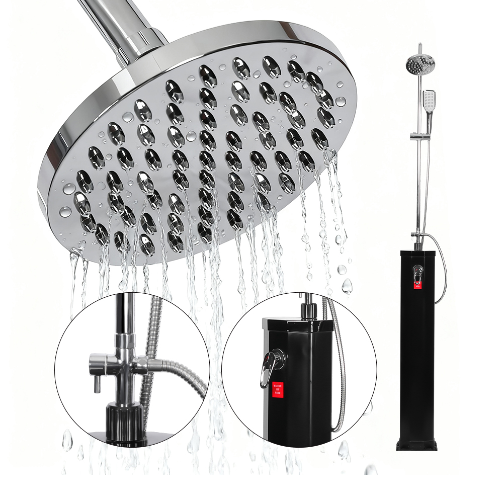 Ez a LY18L09-B 18 literes medence melletti pvc napelemes zuhany mobil rozsdamentes acél fejzuhannyal úgy lett kialakítva, hogy kényelmet és kikapcsolódást biztosítson különféle kültéri környezetben, legyen szó a kertben, a medence mellett vagy a kempingezés során, modern megoldást kínálva a meleg víz élvezetére külső energiaforrások nélkül. Túlméretezett esőzuhanyfejjel rendelkezik, beépített gömbcsuklóval, amely lehetővé teszi a 180°-ig történő könnyű beállítást, rugalmas használatot és egyszerű beállítást biztosítva. A rugalmas esőerdő-stílusú zuhanyfej fokozza az élményt azáltal, hogy könnyedén szabályozhatja a víz áramlását, és olyan megnyugtató, gyógyfürdőhöz hasonló érzést kelt, mintha egy természetes vízesés alatt állna. Ezek a funkciók együtt frissítő és testreszabható zuhanyélményt biztosítanak, így ideális azok számára, akik praktikumra és kikapcsolódásra vágynak a szabadban.