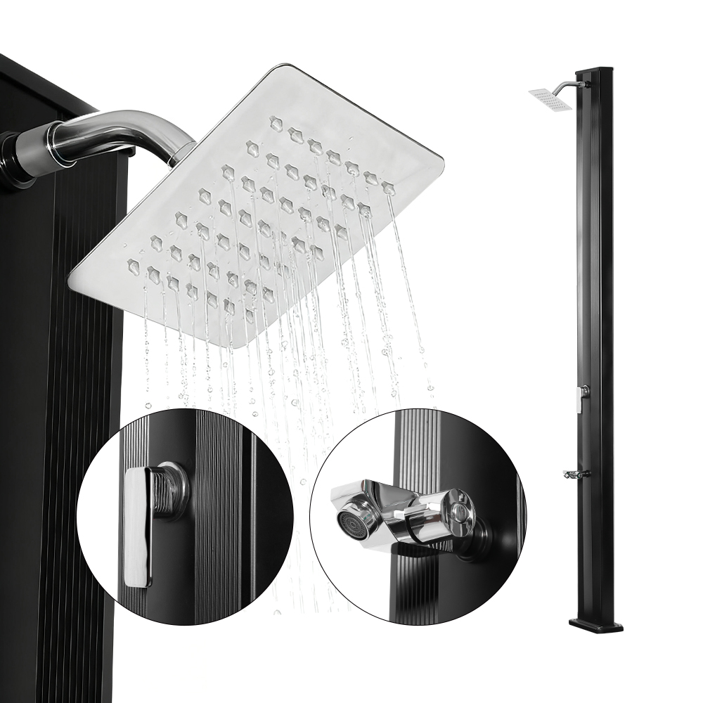 Ez a LY30L02 kültéri esőzuhanyfej egykaros zuhanyállvány 30 literes alumínium zuhanycsővel rendelkezik, amely elegendő vizet biztosít a kényelmes, frissítő zuhanyélményhez, így ideális a kertben vagy a szabadban való használatra. Az egykaros keverőcsap gyors és egyszerű hőmérséklet-beállítást tesz lehetővé, lehetővé téve a felhasználók számára a vízhőmérséklet kívánt beállítását. A nagy esőzuhanyfej beépített gömbcsuklóval rendelkezik, amely 180°-ban elforgatható, fokozva a hűtési hatást és leegyszerűsíti a telepítést a nagyobb kényelem és kényelem érdekében.