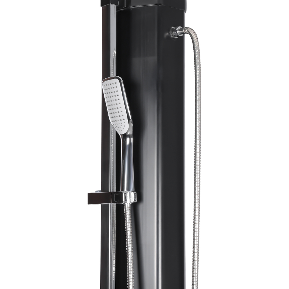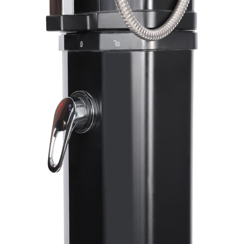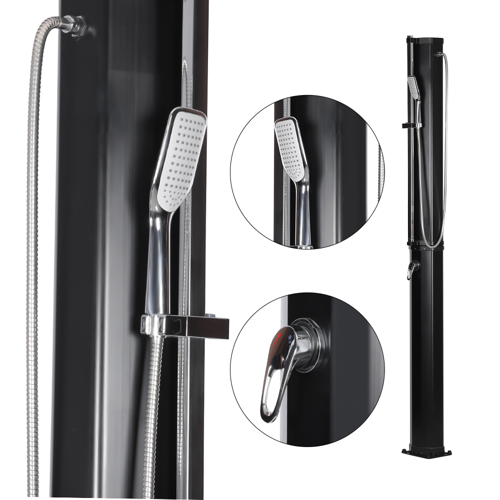 Ez az LY35L08-HB stabil és hatékony, nagy kapacitású kerti napelemes zuhany hatékonyan működik a napfény használatával. A nagy, 35 literes zuhanycső elegendő napfény mellett körülbelül 60°C-ra melegíti fel a vizet. Az újratöltés egyszerű, nem igényel áramot, és könnyen elvégezhető egy szabványos kerti tömlőhöz csatlakoztatva. Nagyméretű esőzuhanyfeje kényelmes hűtési élményt biztosít, az integrált gömbcsukló pedig lehetővé teszi, hogy akár 180°-ban is elfordítható legyen különféle szögekben. A telepítés is nagyon kényelmes. A teljes szerkezet tartós, UV-álló műanyagból készült, amely hatékonyan ellenáll a hosszan tartó kültéri expozíciónak. A zuhanyfej gyorsan szétszerelhető, így könnyen szállítható a helyszínek között, vagy a holtszezonban tárolható. A robusztus fém talp stabilitást és biztonságot nyújt a telepítés után, így kényelmes kültéri zuhanyzót élvezhet a kertben, a medence mellett vagy a kempingben.