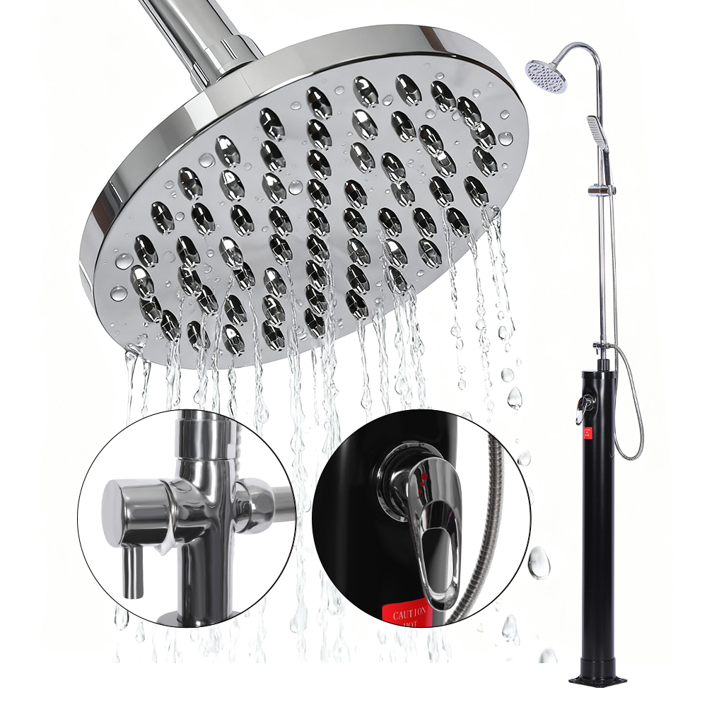 A LY08L03 8L kültéri kerti medence napkollektoros zuhany egykaros keverővel rendelkezik, amely pontosan szabályozza a víz hőmérsékletét úgy, hogy a zuhanycsőből származó meleg vizet keveri a kerti tömlőből származó hideg vízzel. Kerti tömlőcsatlakozóval van felszerelve a kényelmes feltöltéshez és leeresztő dugóval, amely lehetővé teszi a teljes vízelvezetést a biztonságos téli tárolás érdekében. A stabilitás érdekében szilárd rozsdamentes acél alapra épített zuhany egyes részei csavarokkal biztonságosan rögzítve vannak, és a biztonságos használat érdekében rögzíteni kell a talajhoz. A kezelési útmutatót mellékeltük, és több nyelven is elérhető.